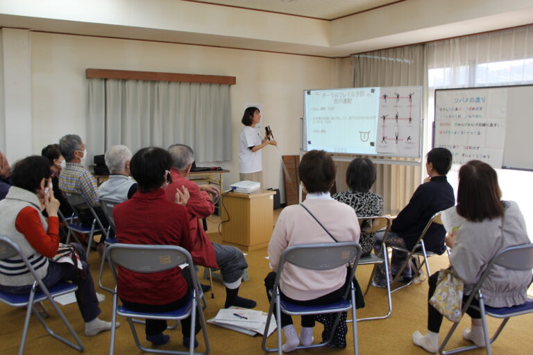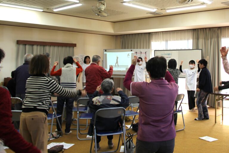 つばめ隊は高齢者の嚥下機能(飲み込み機能)強化のために、近隣の公民館や施設などで「つばめ体操」を行なっています。「つばめ体操」とは嚥下機能向上を意識した運動です。他にも地域の方の健康測定のお手伝いをしています。