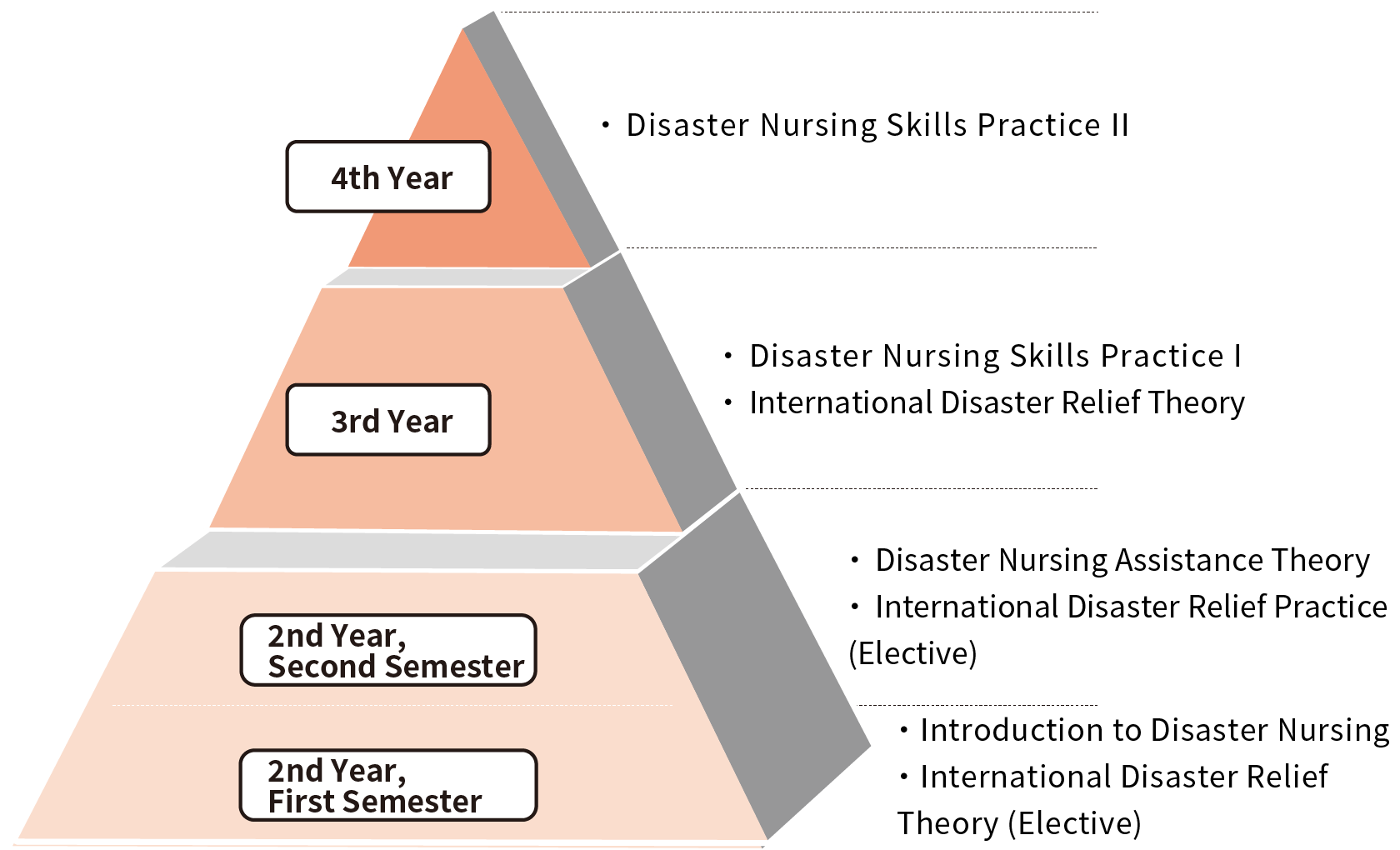 Japanese Red Cross Toyota College of Nursing offers a curriculum that systematically teaches the knowledge and skills that nurses need in disaster situations, both in Japan and abroad. The curriculum moves step-by-step from basic to applied learning. After acquiring essential knowledge, students perform technical exercises, followed by disaster simulation training.