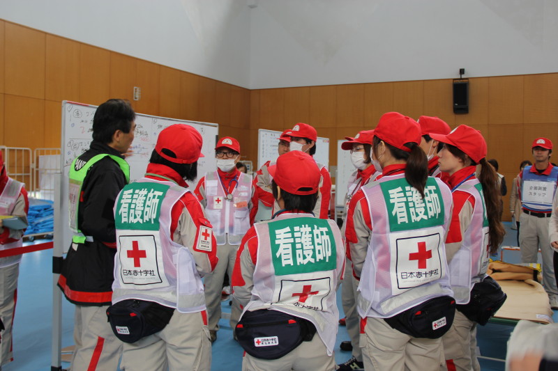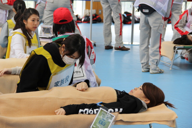 この訓練は、日本赤十字社の行うべき活動の一つに定められている国内救護活動において、災害現場で迅速に適切な対応ができるようにと毎年行われているものです。本学からは救護班の一員として教職員が、傷病者役として学生たちが参加しました。